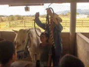 | The boys help with farm chores after school. |
